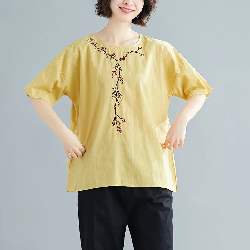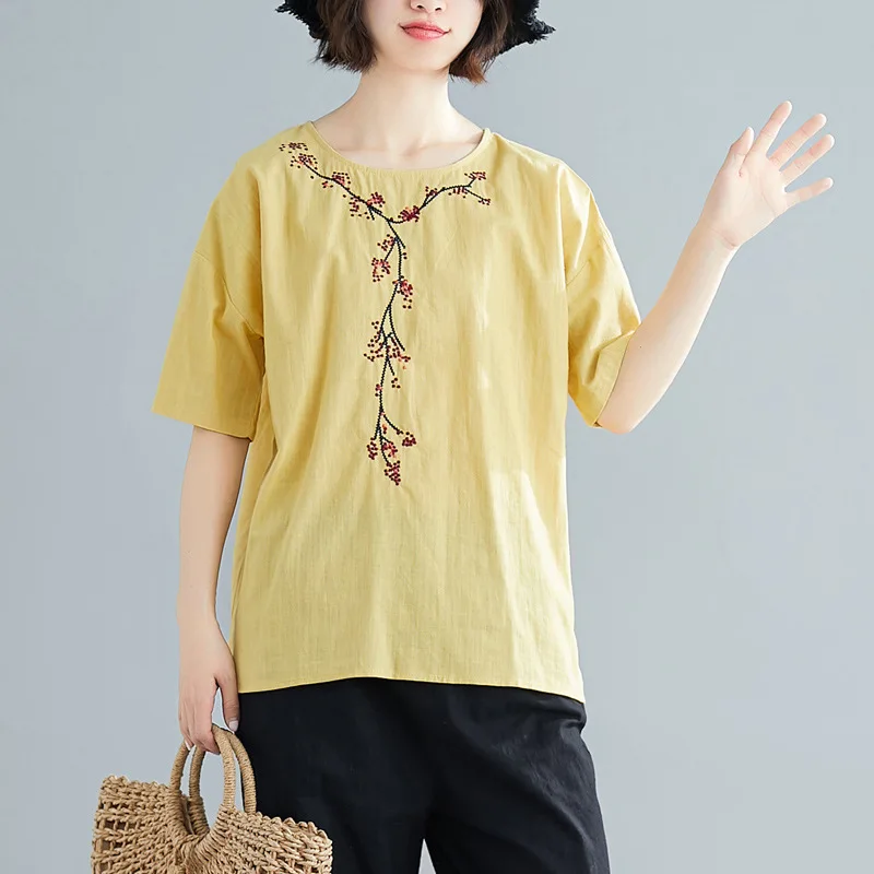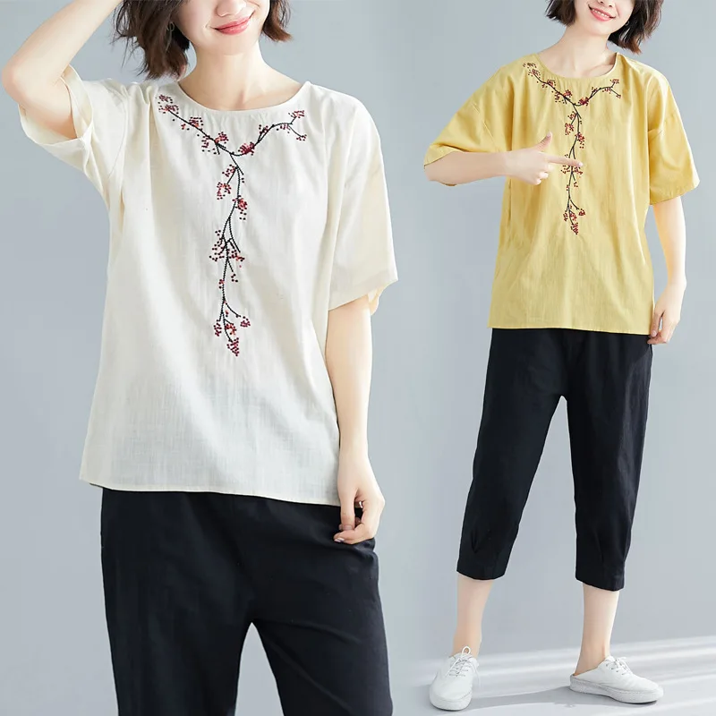 Review Top Photo Shoot WOMEN'S Dress Xia Yifeng Flower Embroidered Cotton Linen Short Sleeve T-shirt Crew Neck