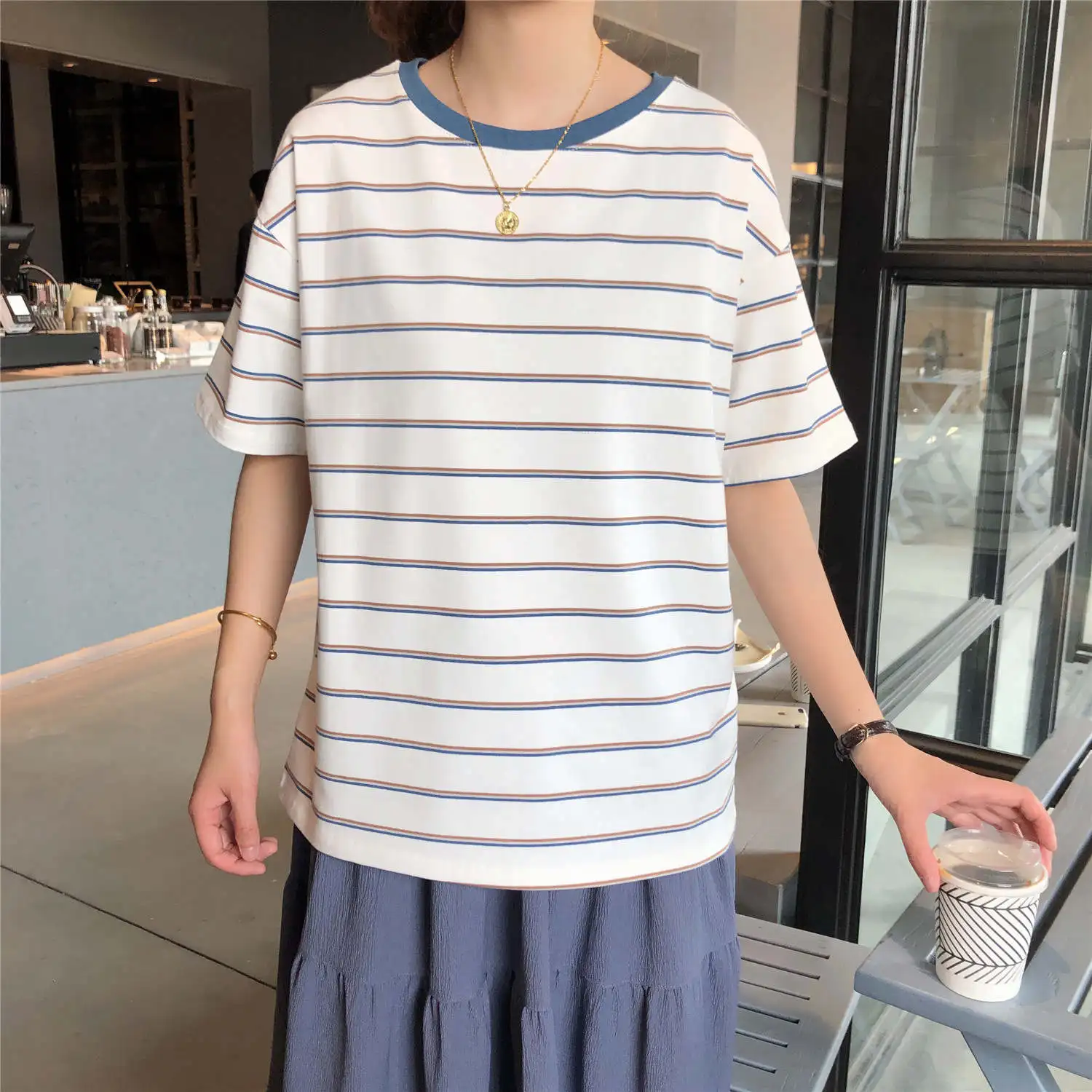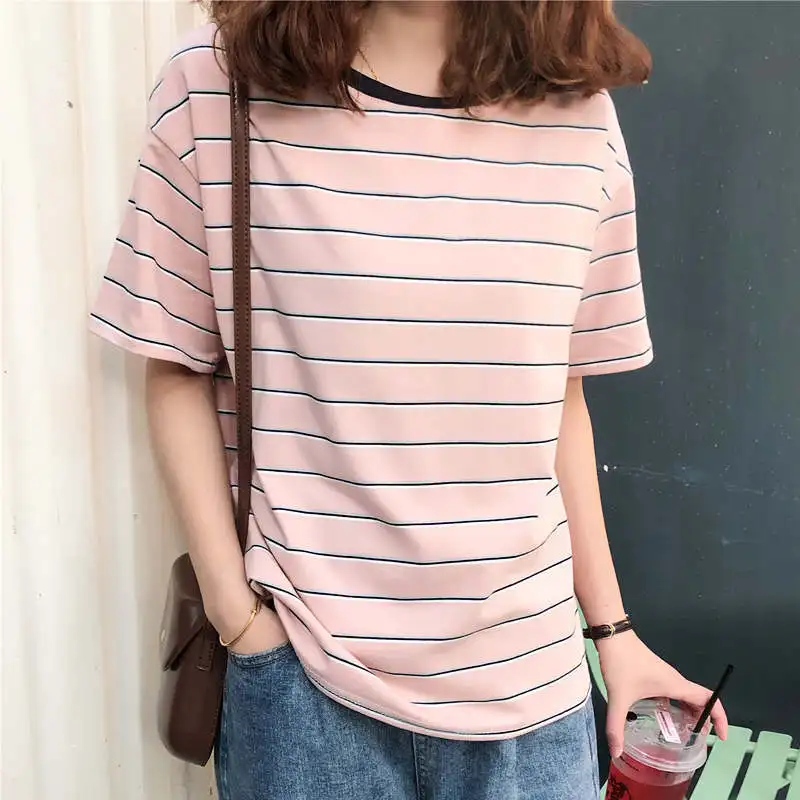 Best Photo Shoot 2019 Summer New Style Korean-style Loose Casual Stripes Hipster Tops Short Sleeve Large