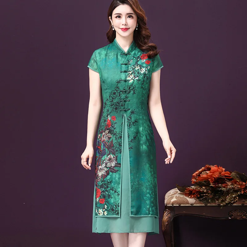 ORIGINAL Photo Shoot Elegant 2019 Summer Middle-aged Women Dress Real Silk Mock Two-Piece Dress WOMEN'S Shor