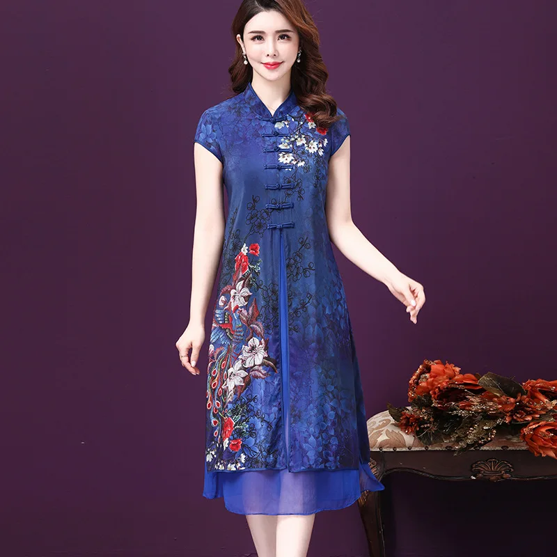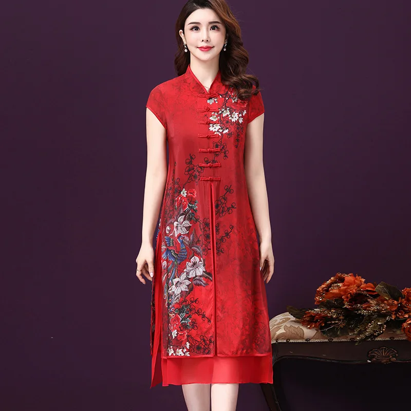 Photo Shoot Elegant 2019 Summer Middle-aged Women Dress Real Silk Mock Two-Piece Dress WOMEN'S Shor