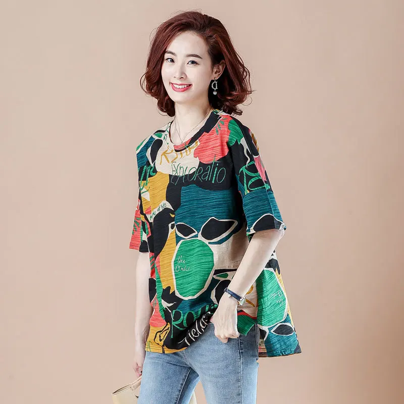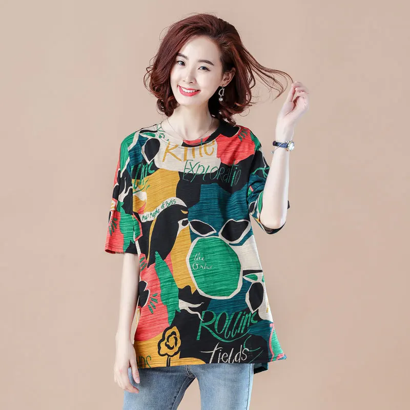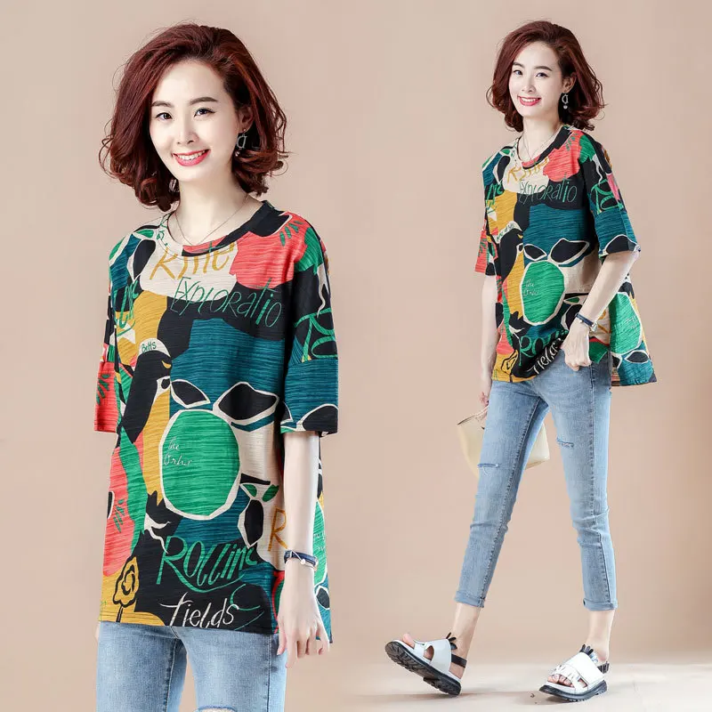 HOT Sale Photo Shoot Large Size Casual Mid-length Contrast Color Printed Lettered T-shirt Fat Mm WOMEN'S Dre